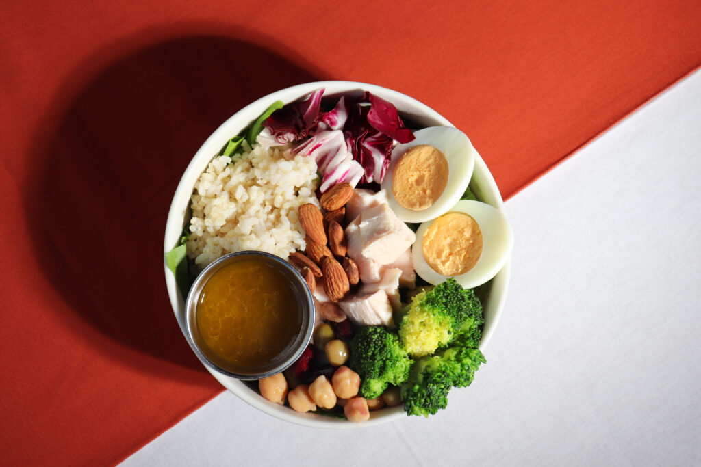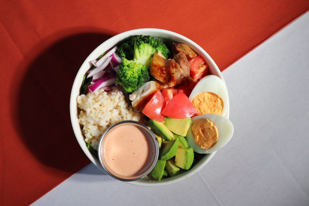 店内で丁寧に調理したグリルチキンや彩り豊かな具材を組み合わせたボリューム満点のサラダボウル。1食で31gの高タンパクを摂取でき、アボカドの良質な脂質や卵のビタミン群が筋肉の回復・ホルモンバランスをサポート。さらに玄米を使用しているため持続的なエネルギー補給にも最適。ブロッコリーやトマトの抗酸化作用もあり、トレーニング後のリカバリーや美容・健康を意識する方におすすめの一皿。
